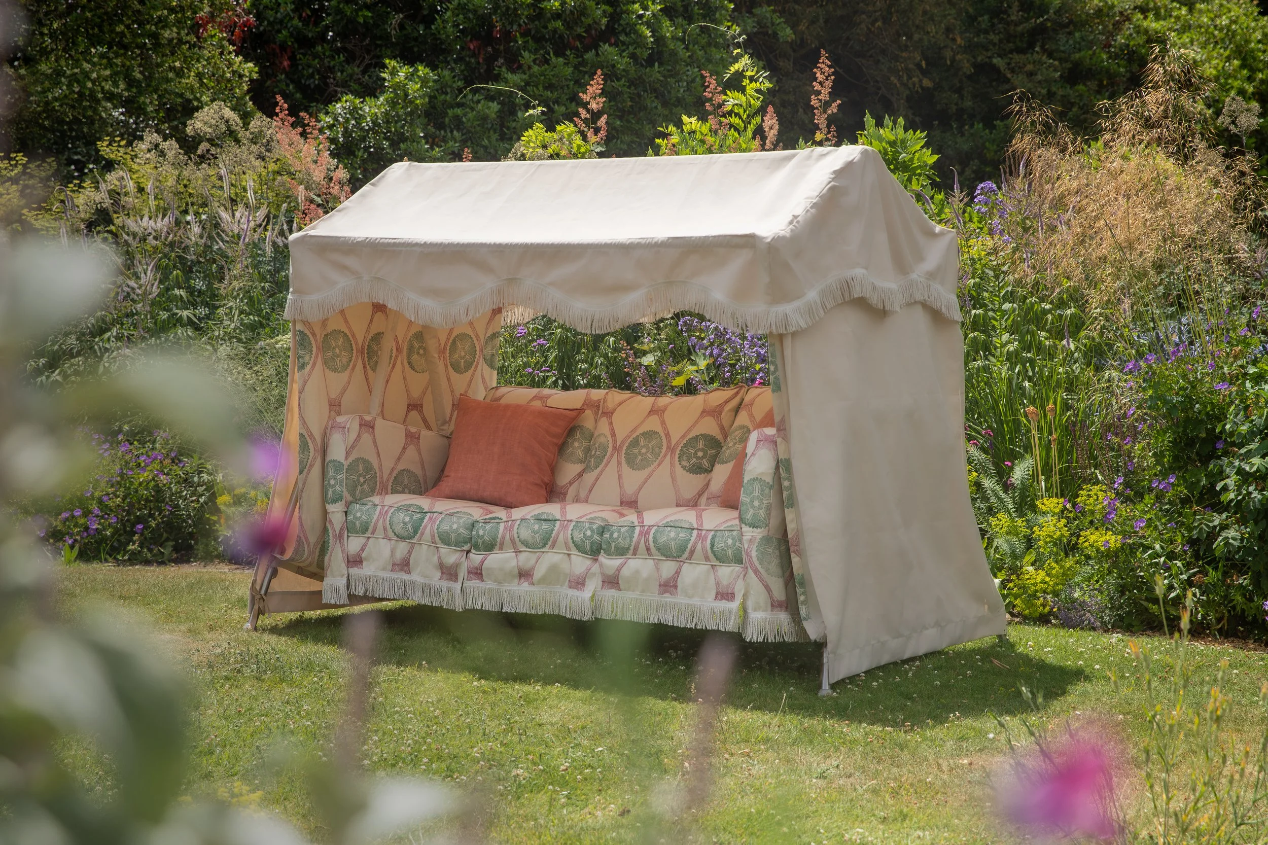In 2025, we collaborated with ODD on a rocker for the garden designer and old friend Frances Rasch. When given a rocker by her husband, Frances asked Speronella to block print the fabric for the inside to concoct a design perfectly suited to her space at Heale Garden in Wiltshire. Our ‘Poppy’ print, first created for Frances some years ago, was the natural choice, using beautiful faded pinks and greens.